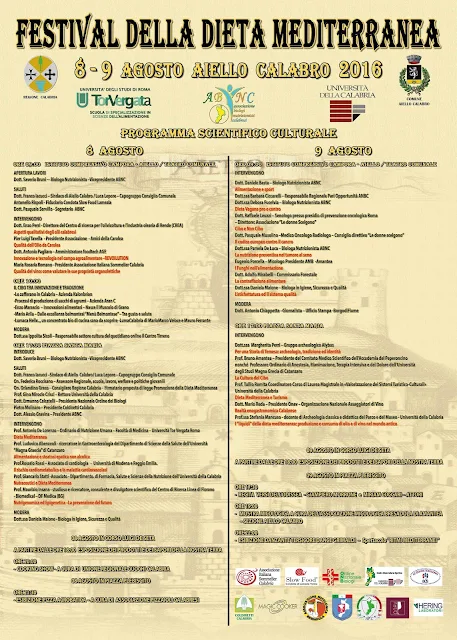 AIELLO CALABRO - L’8 e il 9 agosto l’antico borgo di Aiello Calabro diventerà lo scenario caratteristico che ospiterà il Festival della Dieta Mediterranea, progetto che si propone come “evento laboratorio”, unico in Calabria, dove cultura, storia, scienza, gastronomia ed identità territoriale saranno protagonisti. Il programma dell’evento, promosso dall’associazione biologi nutrizionisti calabresi e patrocinato dal Comune di Aiello Calabro e dalla Regione Calabria, sarà ricco di interventi nei quali medici, biologi, psicologi, professori universitari e ricercatori provenienti da tutta Italia si confronteranno sui temi connessi alla buona alimentazione: dalla prevenzione delle malattie all’educazione e alla sicurezza alimentare; dalla sostenibilità ambientale alla portata sociale, culturale ed economica della dieta mediterranea.
